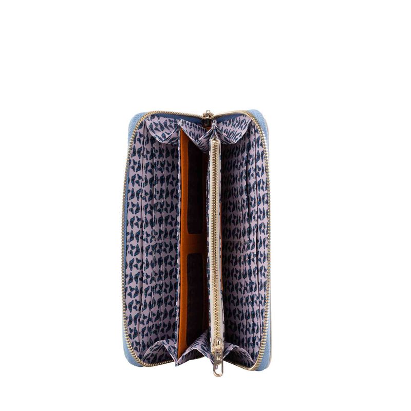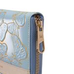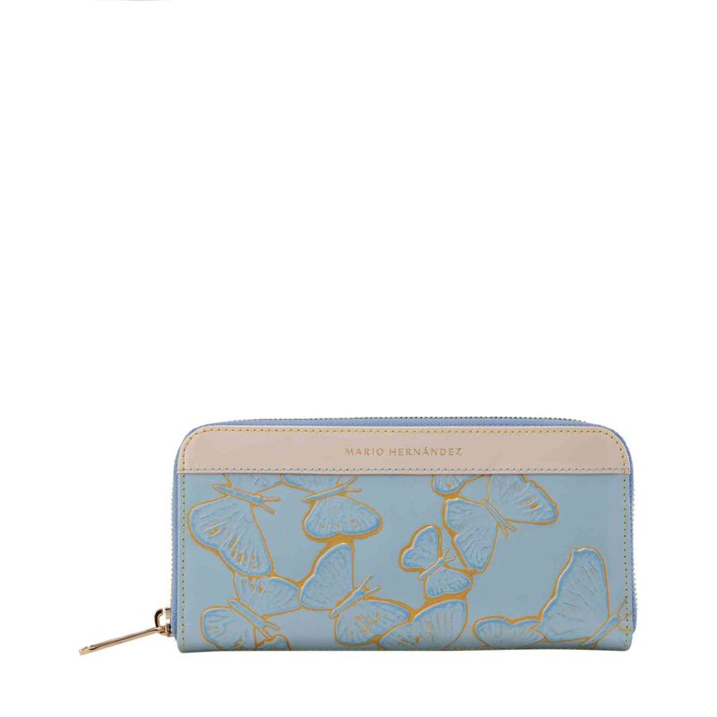 Esta versión de color de la colección emblemática de la marca es perfecta para las ciudades de clima cálido o para llevar con looks de verano. Las mariposas grabadas sobre la piel azul pastel resaltan gracias a un efecto dorado y contrastan con el cuero naranja y beige que la acompañan como complemento. Un básico para las amantes de los todos suaves y fáciles de combinar. .