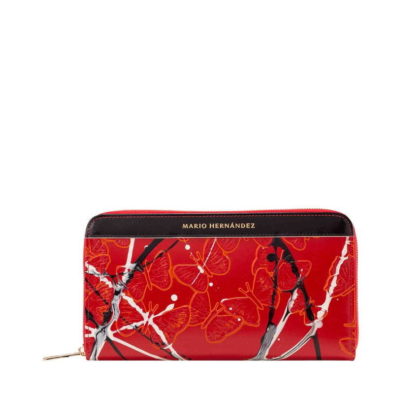 La colección emblemática de MARIO HERNÁNDEZ se viste creatividad para rendir homenaje a quienes se dedican a expresarse a través de la pintura. El cuero de esta línea, tinturado a mano en Italia mediante un proceso especial conocido como tamponado, ofrece diferentes efectos de color y textura. En este caso, las mariposas grabadas sobre la piel roja, a la que se han añadido pinceladas negras y blancas, resaltan sutilmente gracias a un halo dorado..