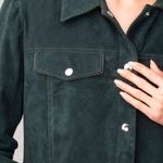 Esta prenda tiene la misma silueta de la chaqueta de denim. Su estilo es casual atemporal, así que complementará de maravilla tus atuendos de fin de semana. Está hecha de gamuza y cuenta con cierre de botones metálicos.