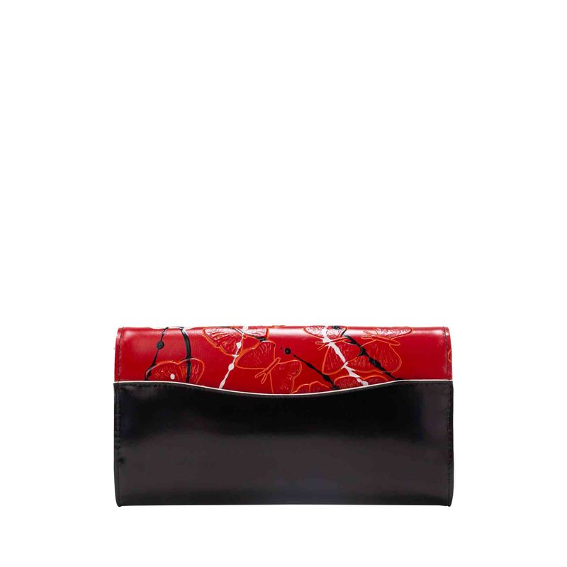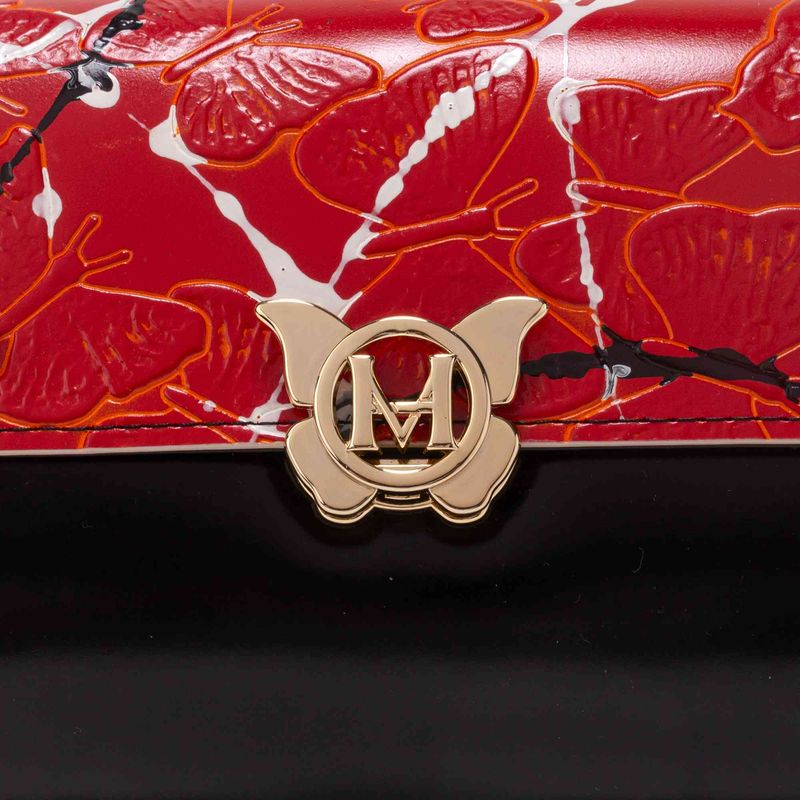 La colección emblemática de MARIO HERNÁNDEZ se viste creatividad para rendir homenaje a quienes se dedican a expresarse a través de la pintura. El cuero de esta línea, tinturado a mano en Italia mediante un proceso especial conocido como tamponado, ofrece diferentes efectos de color y textura. En este caso, las mariposas grabadas sobre la piel roja, a la que se han añadido pinceladas negras y blancas, resaltan sutilmente gracias a un halo dorado..