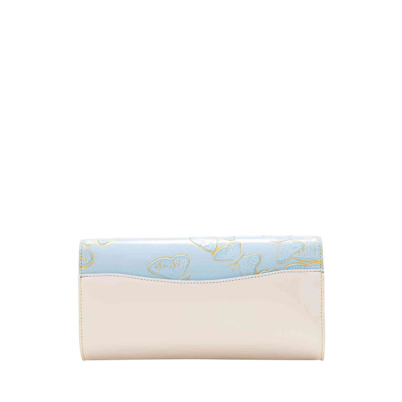 Esta versión de color de la colección emblemática de la marca es perfecta para las ciudades de clima cálido o para llevar con looks de verano. Las mariposas grabadas sobre la piel azul pastel resaltan gracias a un efecto dorado y contrastan con el cuero naranja y beige que la acompañan como complemento. Un básico para las amantes de los todos suaves y fáciles de combinar..