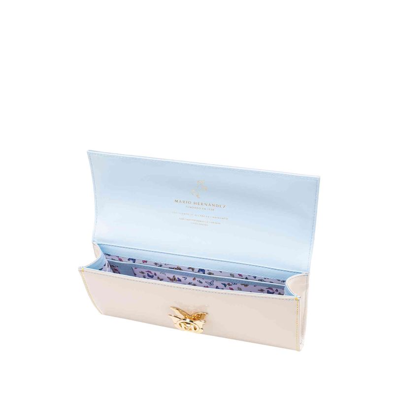 * Cuero principal vacuno de procedencia italiana con placa exclusiva de mariposas MH, y los cueros complementos se mezclan entre texturizados, lisos y charolados que dan un perfecto balance para realzar las icónicas mariposas. <br> * Exclusividad de formas, colores y detalles hechos a mano. <br> * Forro 100% poliéster con recubrimiento impermeable. <br> * Herrajes en zamac acabados en color oro claro y Niquel y con detalles representativos de la marca.