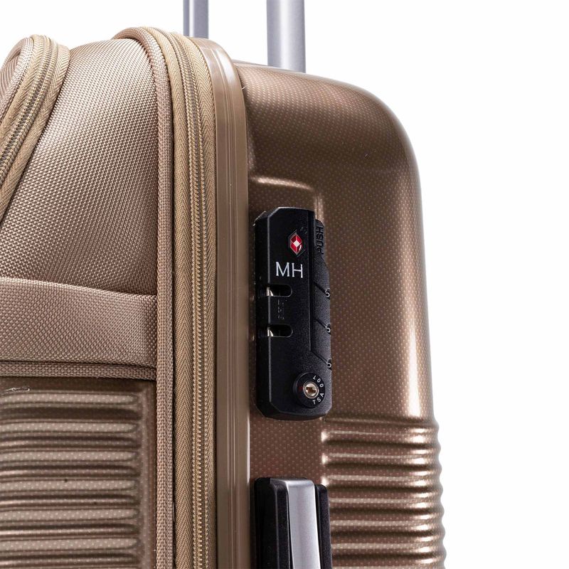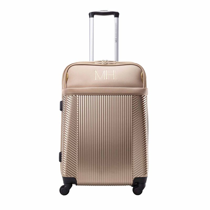 Esta línea de maletas de viaje semirrígidas, hechas en lona, es versátil y ligera. Cuenta con ruedas que giran 360°, tres tipos de manija y cierre de cremallera con clave. Se destaca de su diseño el rombo con las iniciales MH de color contrastante.