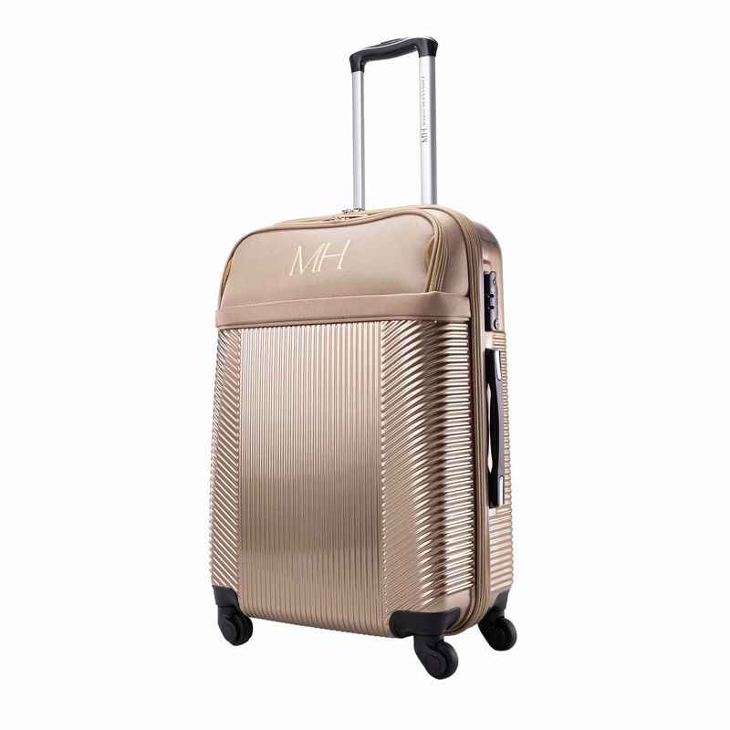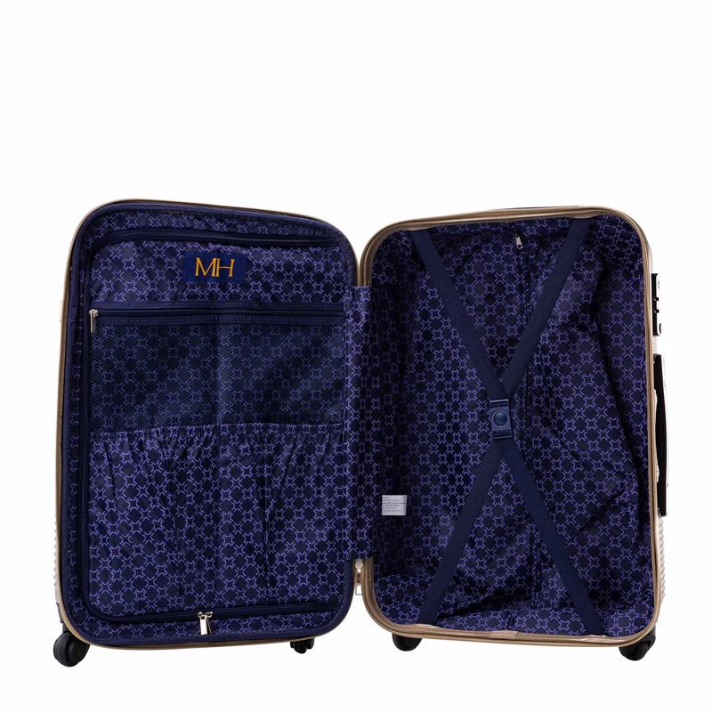 Esta línea de maletas de viaje semirrígidas, hechas en lona, es versátil y ligera. Cuenta con ruedas que giran 360°, tres tipos de manija y cierre de cremallera con clave. Se destaca de su diseño el rombo con las iniciales MH de color contrastante..