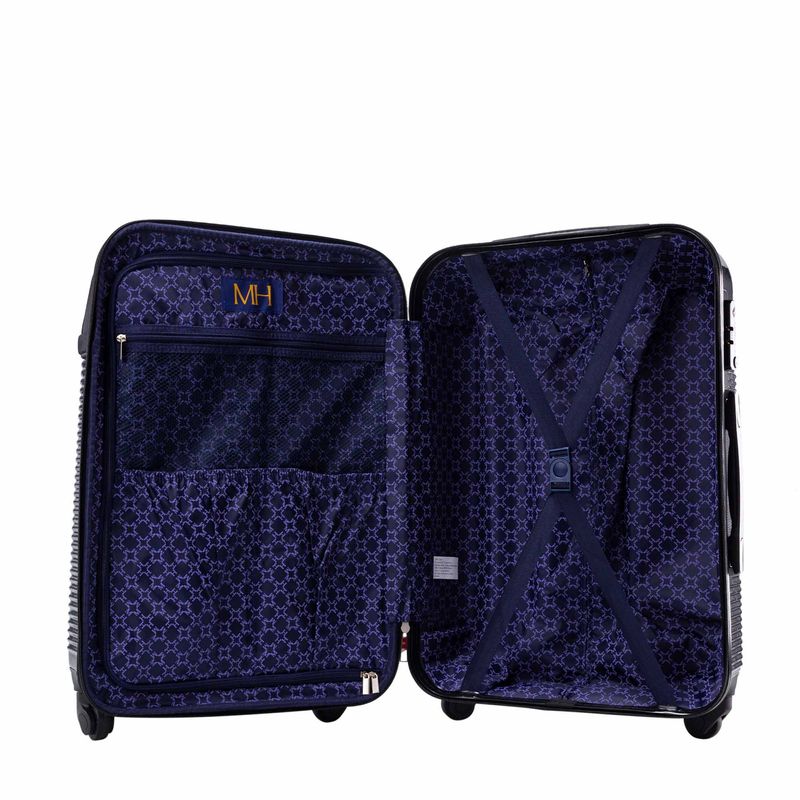 Esta línea de maletas de viaje semirrígidas, hechas en lona, es versátil y ligera. Cuenta con ruedas que giran 360°, tres tipos de manija y cierre de cremallera con clave. Se destaca de su diseño el rombo con las iniciales MH de color contrastante..