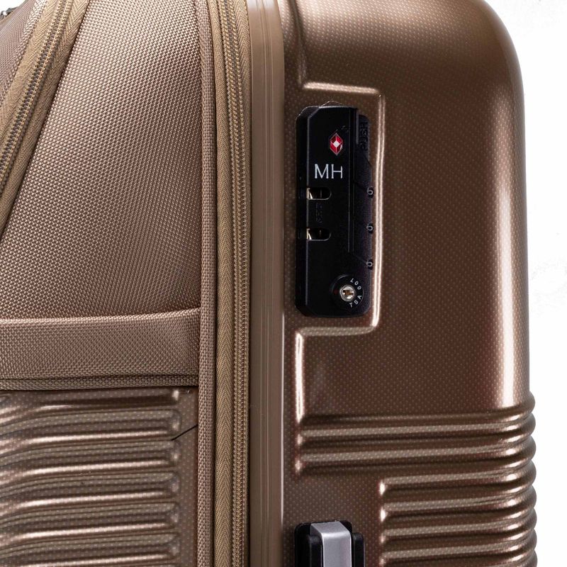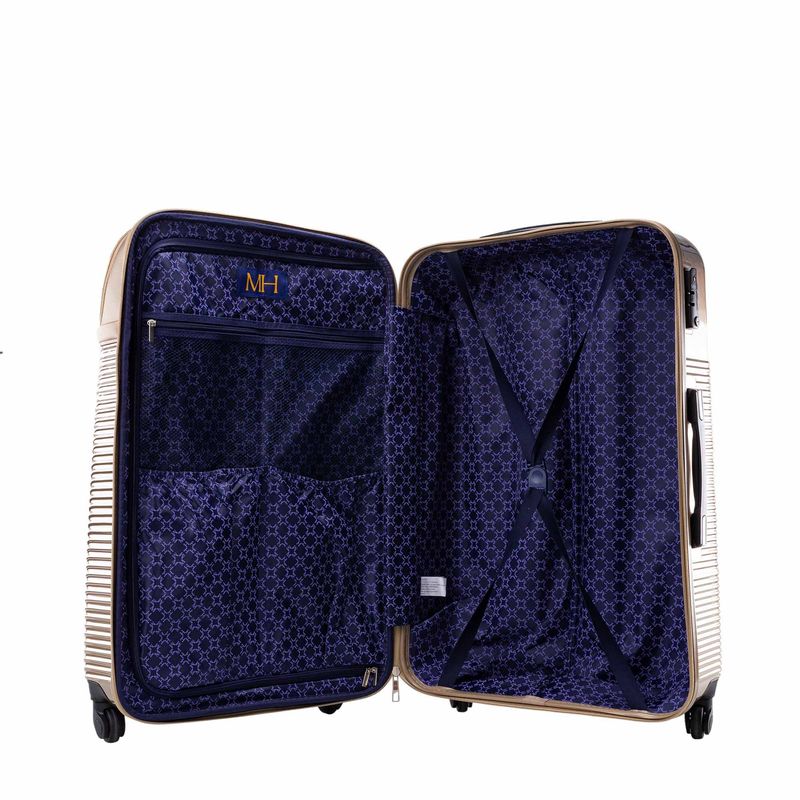 Esta línea de maletas de viaje semirrígidas, hechas en lona, es versátil y ligera. Cuenta con ruedas que giran 360°, tres tipos de manija y cierre de cremallera con clave. Se destaca de su diseño el rombo con las iniciales MH de color contrastante.