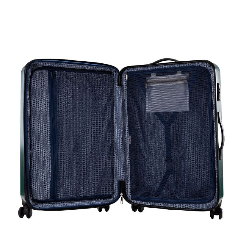 Esta colorida línea de maletas hechas en policarbonato, lleva el nombre MARIO HERNÁNDEZ en altorrelieve. Ligera y resistente a los golpes, las piezas de la colección tienen cuerpo expandible, candado TSA y cortina interna..