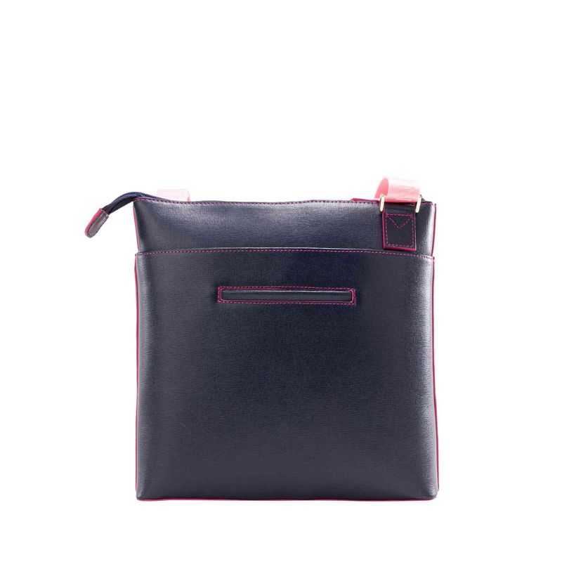 * Cueros grabados tipo saffiano. <br> * Forro 100% poliéster con recubrimiento impermeable. <br> * Herrajes en zamac con acabado en color oro claro.