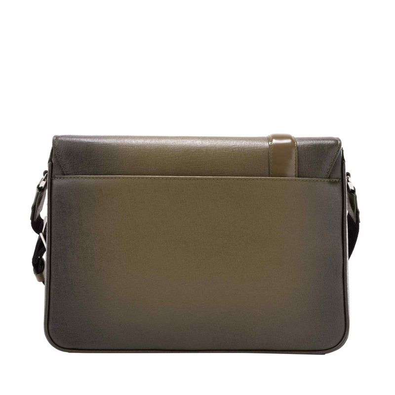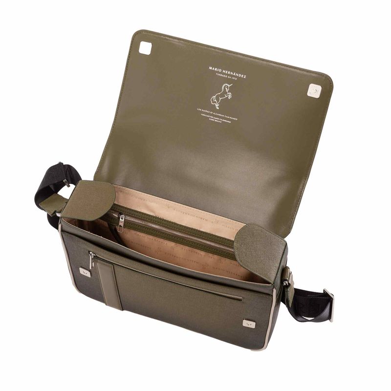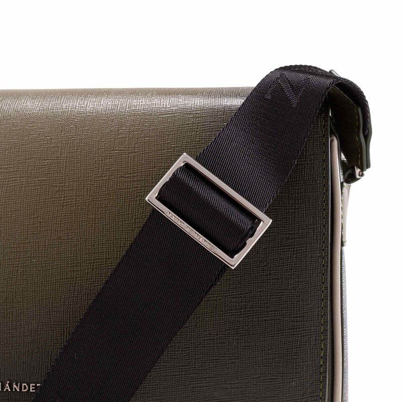 * Cuero vacuno con acabado de placa Saffiano como material principal. <br> * Herrajes en zamac con acabados en color níquel.