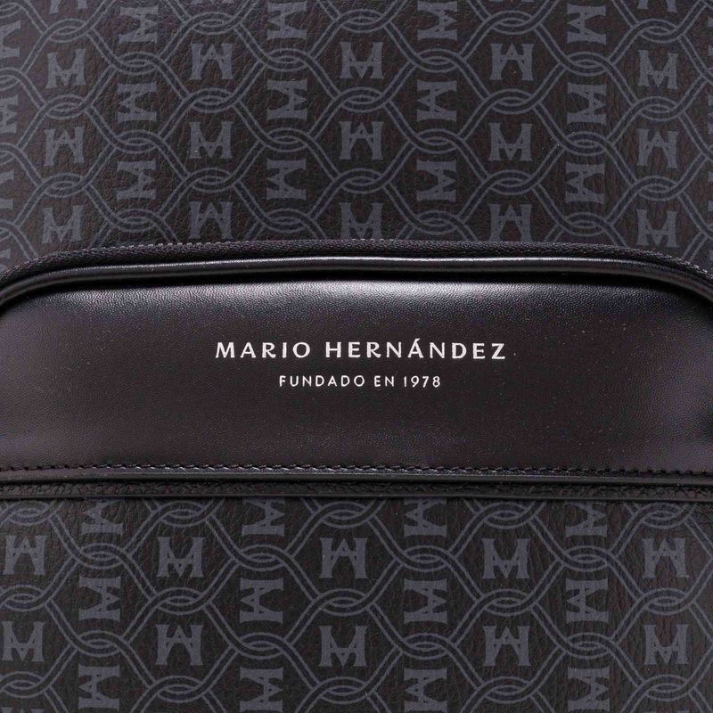 * Lona sintética texturizada con patrón exclusivo MH Palenque, complementado con detalles externos e internos en cuero vacuno liso. <br> * Forro en fibras textiles 100% algodón. <br> * Herrajes en zamac con acabados en color níquel y negro níquel.