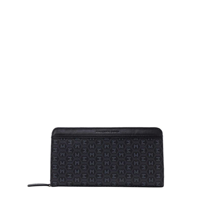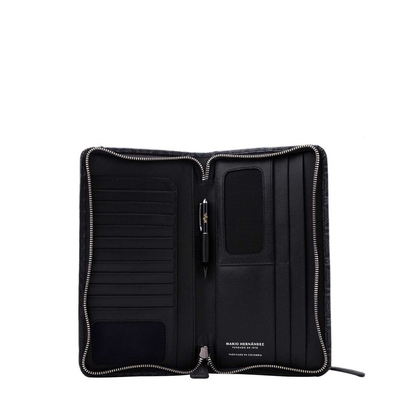* Lona sintética texturizada con patrón exclusivo MH Palenque, complementado con detalles externos e internos en cuero vacuno liso. <br> * El reves del material principal esta recubierto con fibras textiles 100% algodón, material que se usa en sus bolsillos internos. Sin forro. <br> * Herrajes en zamac con acabados en color níquel y negro níquel.