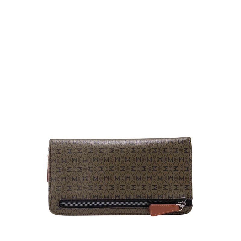 * Lona sintética texturizada con patrón exclusivo MH Palenque, complementado con detalles externos e internos en cuero vacuno liso. <br> * El reves del material principal esta recubierto con fibras textiles 100% algodón, material que se usa en sus bolsillos internos. Sin forro. <br> * Herrajes en zamac con acabados en color níquel y negro níquel.
