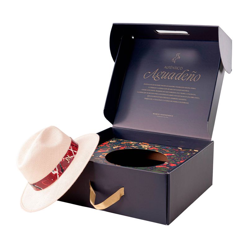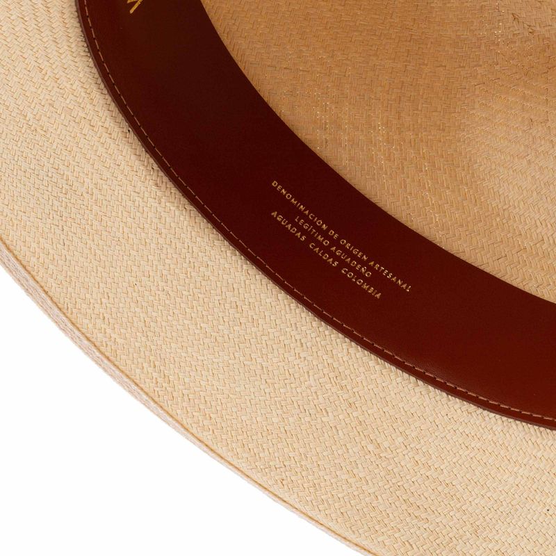 El sombrero aguadeño es una pieza representativa de la riqueza artesanal que tiene Colombia. Su laborioso tejido, hecho de fibra de palma de iraca, se realiza ciento por ciento a mano en Aguadas, Caldas, y su construcción se finaliza en nuestra fábrica en Bogotá, donde expertos artesanos se encargan de ponerle el tafilete y la cinta de cuero, y marcarlo con un sello al calor en la cara interna de la copa.