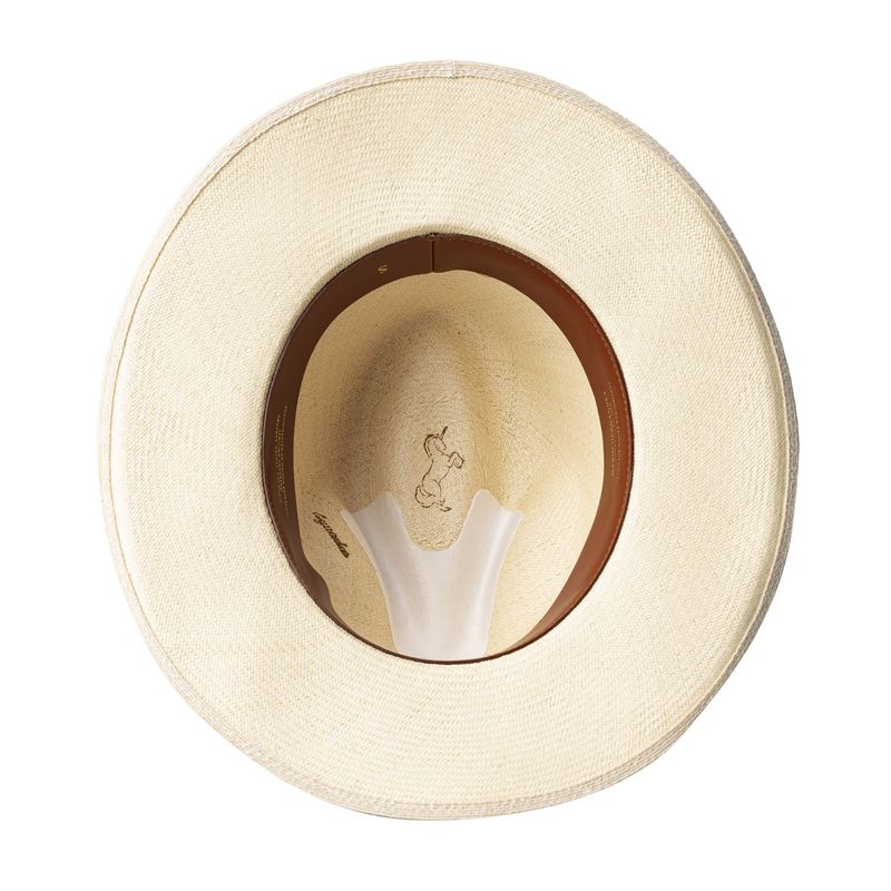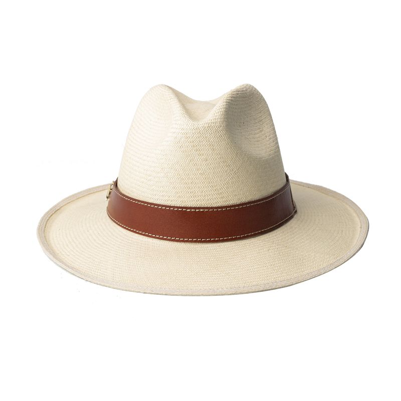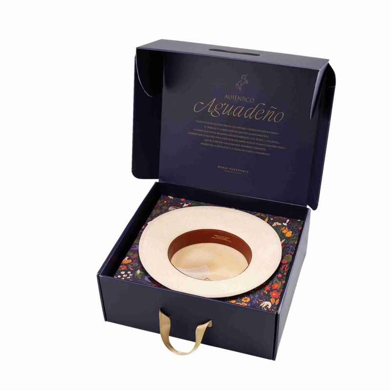 El sombrero aguadeño es una pieza representativa de la riqueza artesanal que tiene Colombia. Su laborioso tejido, hecho de fibra de palma de iraca, se realiza ciento por ciento a mano en Aguadas, Caldas, y su construcción se finaliza en nuestra fábrica en Bogotá, donde expertos artesanos se encargan de ponerle el tafilete y la cinta de cuero, y marcarlo con un sello al calor en la cara interna de la copa.