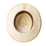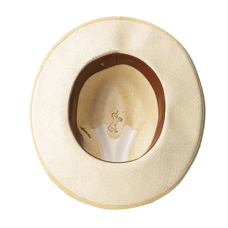El sombrero aguadeño es una pieza representativa de la riqueza artesanal que tiene Colombia. Su laborioso tejido, hecho de fibra de palma de iraca, se realiza ciento por ciento a mano en Aguadas, Caldas, y su construcción se finaliza en nuestra fábrica en Bogotá, donde expertos artesanos se encargan de ponerle el tafilete y la cinta de cuero, y marcarlo con un sello al calor en la cara interna de la copa.